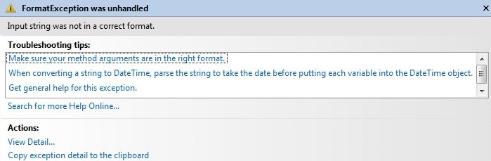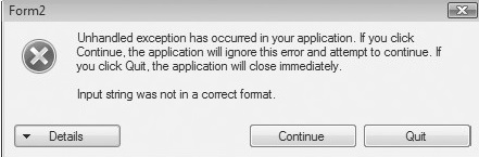 Bu mesajda sadece hatanın kaba bir tanımı bulunmaktadır. Şekildeki örnekte hata için sadece “Input string was not in a correct format” (Girilen yazı doğru biçimde değil) tanımı verilmektedir. Bu hatanın hangi satırda olduğu, hatanın daha detaylı bir açıklaması gibi bilgiler yoktur. Details (Detay) düğmesine tıklanırsa çok karışık, kullanıcıların, hatta yazılımcıların, hiçbir şey anlamayacağı yazılar ortaya çıkar.