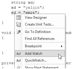 Bir değişkeni veya kontrolü izlemek için adını illaki watch penceresine elle yazmanıza gerek yoktur. İzlemek istediğiniz değişkeni veya kontrolün adını koddan seçip watch penceresi üzerine sürükleyip bırakabilirsiniz.Başka bir alternatif olarak,       Şekilde görüldüğü gibi bir değişken ya da kontrolün adının üzerinde sağ tıklama yaparak Add Watch seçeneğini de seçebilirsiniz.