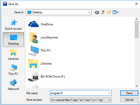 Dosya adını yazıp istediğin klosere kaydedebilirsiniz.Ardından çalıştırın.
