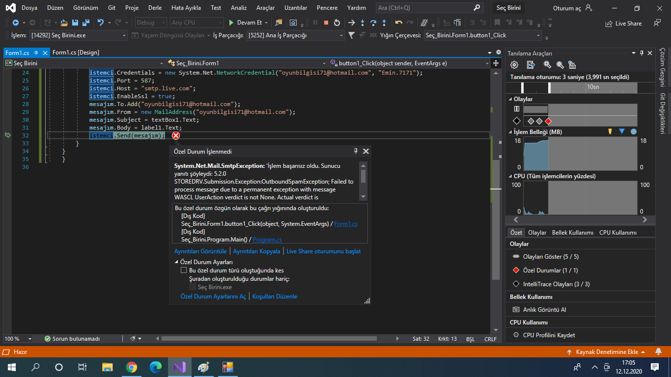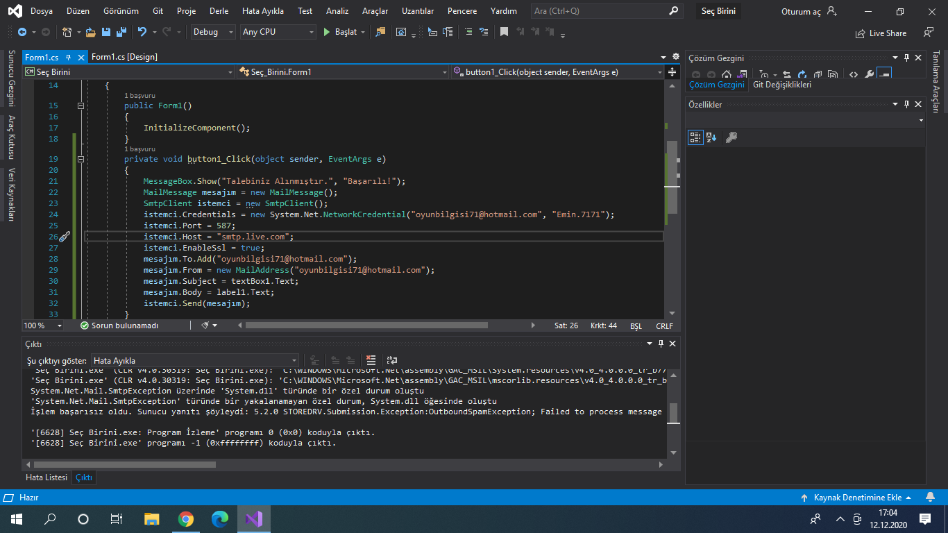 Merhaba ben C# ile bir uygulama geliştirmek istiyorum ve bana mail gelmesini istiyorum ancak "System.Net.Mail.SmtpException: 'İşlem başarısız oldu. Sunucu yanıtı şöyleydi: 5.2.0 STOREDRV.Submission.Exception:OutboundSpamException; Failed to process message due to a permanent exception with message WASCL UserAction verdict is not None. Actual verdict is RefuseQuota, ShowTierUpgrade. OutboundSpamException: WASCL UserAction verdict is not None. Actual verdict is RefuseQuota, ShowTierUpgrade. [Hostname=DBBPR03MB7019.eurprd03.prod.outlook.com]'" hatası alıyorum ne yapmalıyım ? kodlarım şöyle: